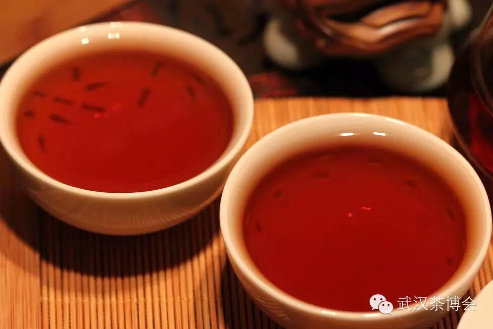 茶汤红色,香气中已无生青味、蜜甜香混合着陈香,口感几无苦涩,入口苦涩味化得很快,茶汤浓稠有点像米汤,干茶黑而油亮,冲泡之后叶底黄带褐色。